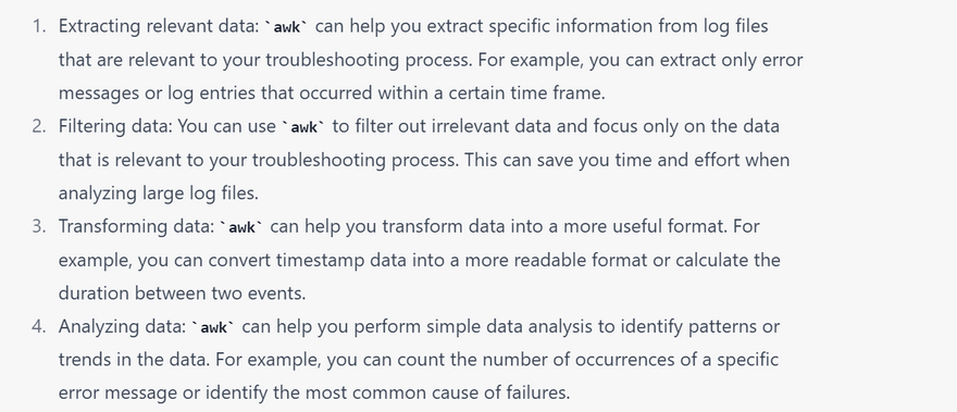 Here's an example of how the awk command can be used in troubleshooting to extract relevant information from log files.