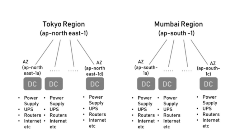 For Example, the Mumbai AZ ap-south-1a might be in the east of Mumbai and ap-south-1c in the west. This way if there is any natural catastrophe like flood or fire around one of the AZs, it doesn’t affect the other AZs. Also, each of the Data Center (DC) has its own redundancy of Power Supply, UPS, Routers, Internet Connectivity, etc to avoid any Single-Point-Of-Failure. There is no common infrastructure between two DCs and the DCs are connected by high-speed internet connectivity for low latency.