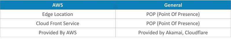 Edge Locations is an AWS term provided by the AWS CloudFront Service. An AWS Edge Location is called PoP (Points of Presence) in general term. A similar service is provided by Content Distribution Network (CDN) providers like Akamai, Cloudflare, etc. These CDN providers cache the data like streaming video during a live match to provide a better experience to the end-user. Below is the table comparing the AWS and the general terminology.