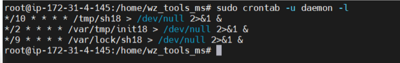 This output indicates that in the daemon user's crontab file (/var/spool/cron/crontabs/daemon), there's a cron job scheduled to run a script (bash18_script.sh) using bash18 every 5 minutes. Similarly, you can run the command for other executables (sh18, init18, etc.) to find their occurrences in the crontab files.