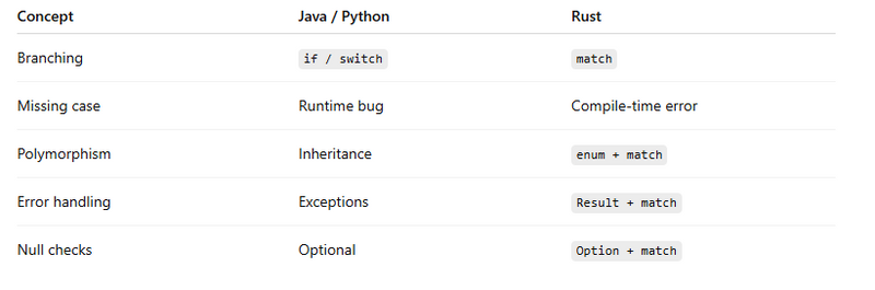 In Rust, match is the primary decision-making tool. It doesn’t just replace switch; it covers many if/else patterns too, while adding safety and expressiveness that Java/Python don’t have.