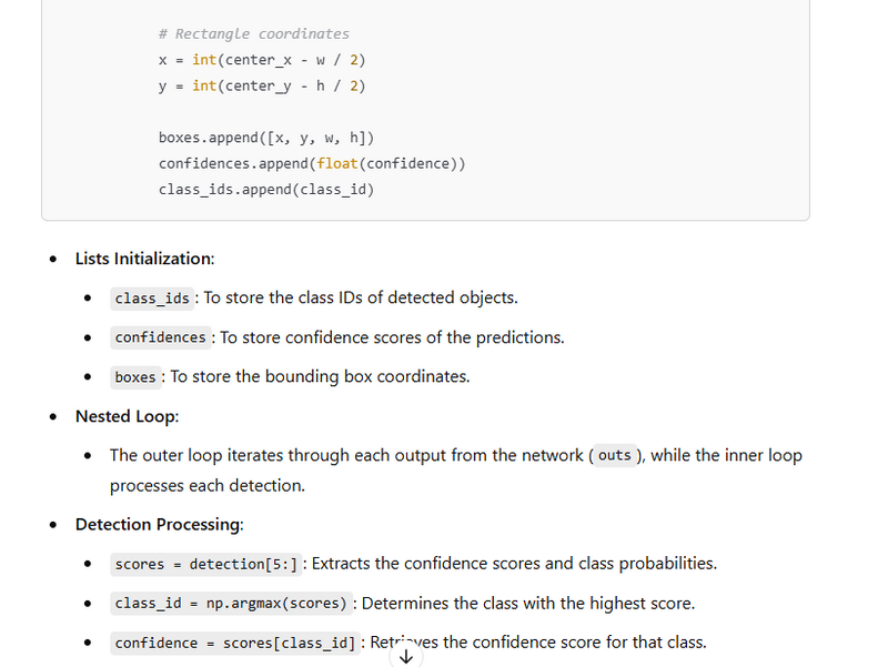 Processing the Outputs==>Lists Initialization+ Nested Loop + Detection Processing:(scores,class_id ,confidence)