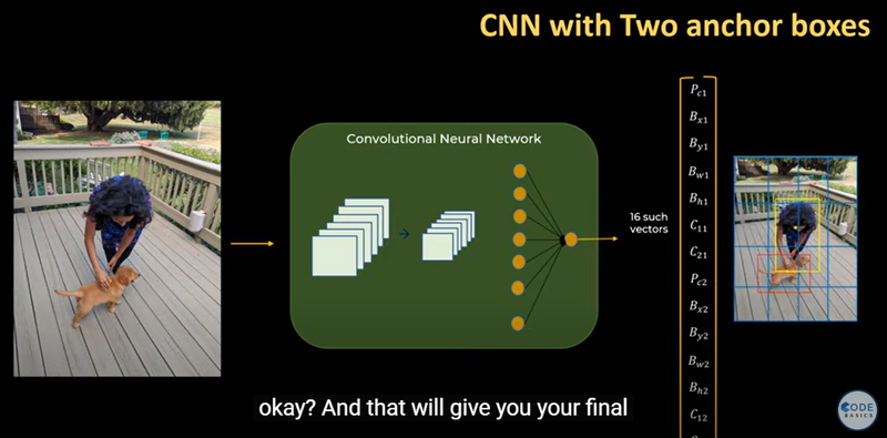 how a CNN processes an input image to generate predictions based on those anchor boxes.