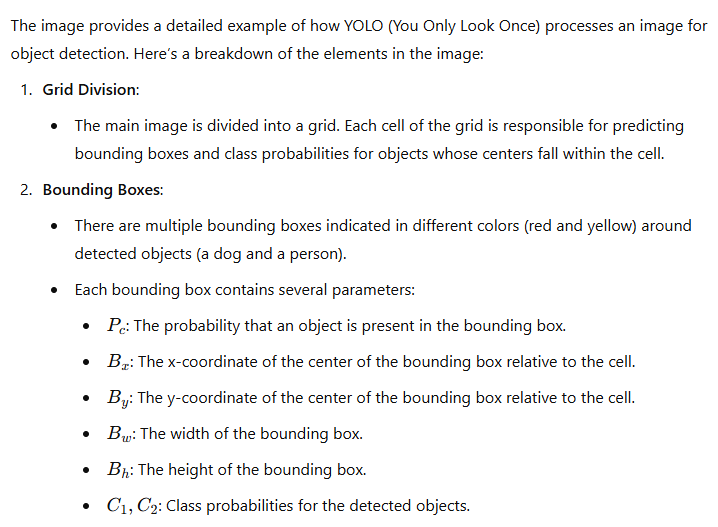 How It Works: YOLO divides the input image into a grid and predicts bounding boxes and confidence scores for each grid cell. This means it looks at the image only once to identify multiple objects, which makes it much faster than previous methods that required multiple passes.