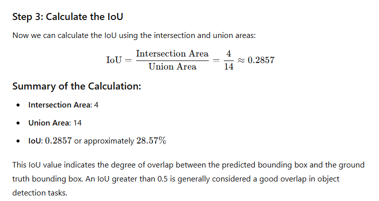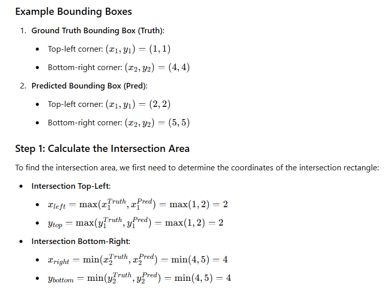 To calculate the Intersection over Union (IoU) using a numerical example, let's take two bounding boxes: the predicted bounding box (Pred) and the ground truth bounding box (Truth). We'll define their coordinates and calculate the IoU step-by-step.