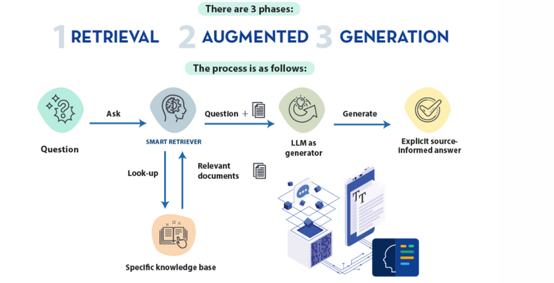 Generation step: The generative model, using the retrieved documents, formulates an accurate and detailed response for the user.