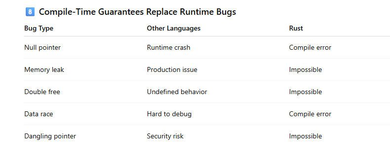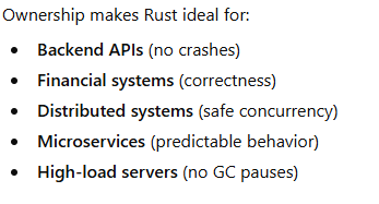 “Rust’s ownership system makes the language reliable by enforcing memory safety, preventing data races, and eliminating entire classes of runtime bugs at compile time—without using a garbage collector.”