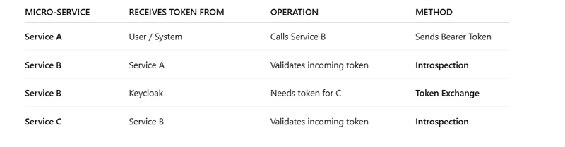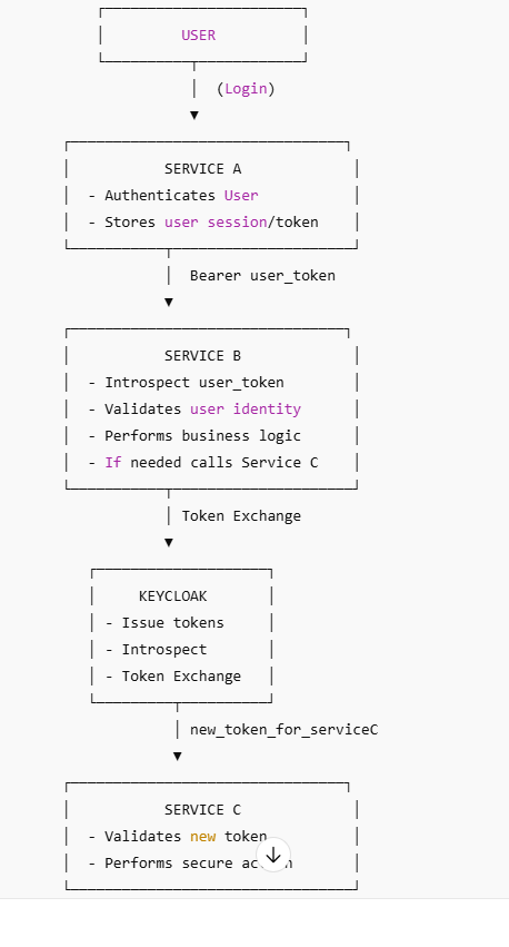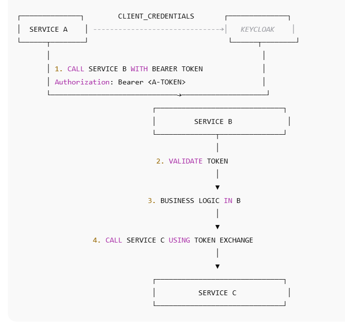 Service B token → Keycloak token exchange → Service C token