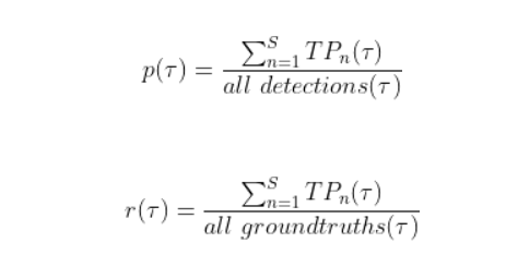 To recap, the output of an object detector is characterized by a bounding box, a class, and a confidence score. The confidence score can be taken into account in the precision and recall calculations by considering as positive detections only those whose confidence is larger than a confidence threshold τ. The detections whose confidence level is smaller than τ are considered as negatives.
