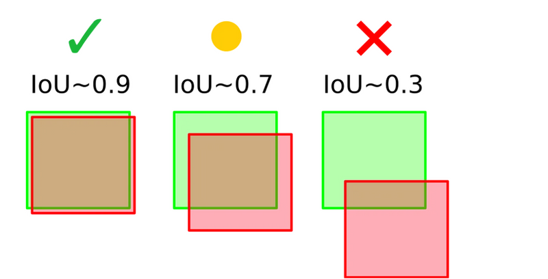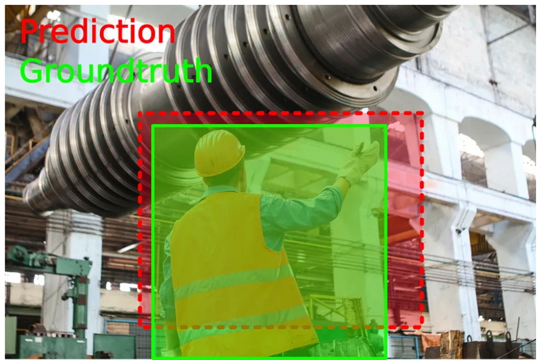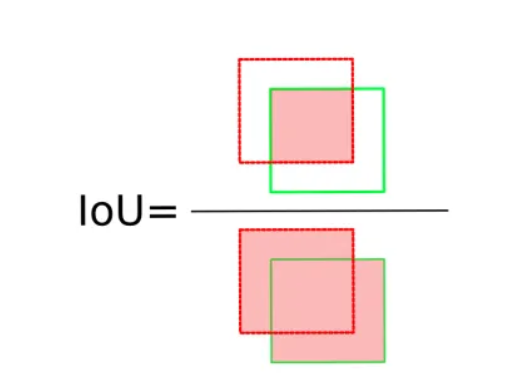 These two conditions are assessed by the intersection over union (IoU), a measurement based on the Jaccard index, a coefficient of similarity for two sets of data. In the object detection scope, the IoU is equal to the area of the overlap (intersection) between the predicted bounding box (red) and the ground-truth bounding box (green) divided by the area of their union.
