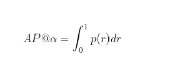 The precision-recall (PR) curve is a plot of precision as a function of recall. It shows the trade-off between the two metrics for varying confidence values for the model detections. AP@α is the Area Under the precision-recall curve (AUC-PR). Mathematically, AP is defined as: