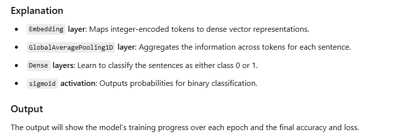 For text classification, we'll use the pipeline and pass batches to a simple neural network. Here, we’ll build a binary classification model using an embedding layer and a few dense layers.