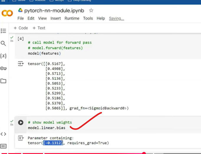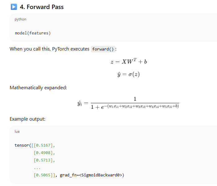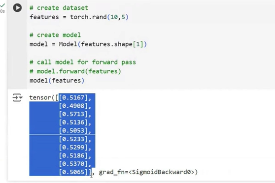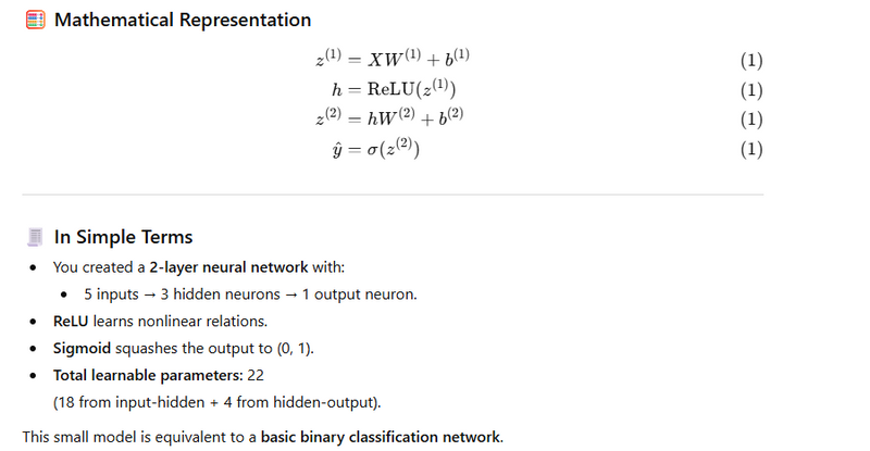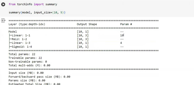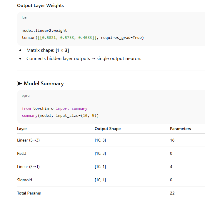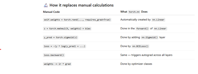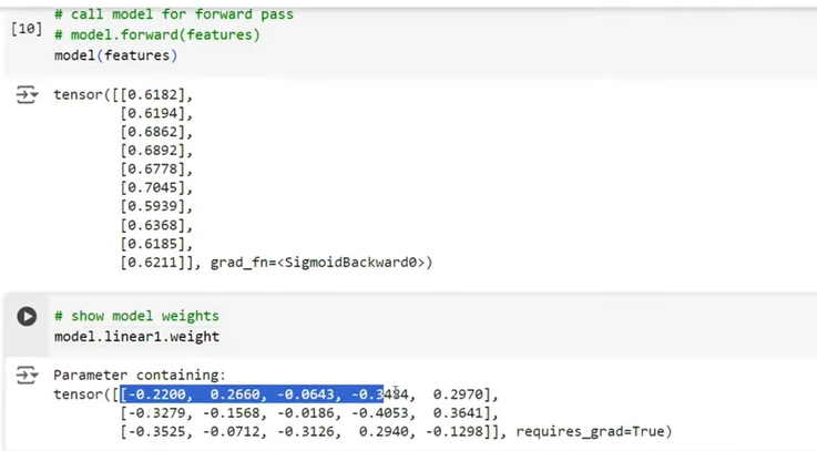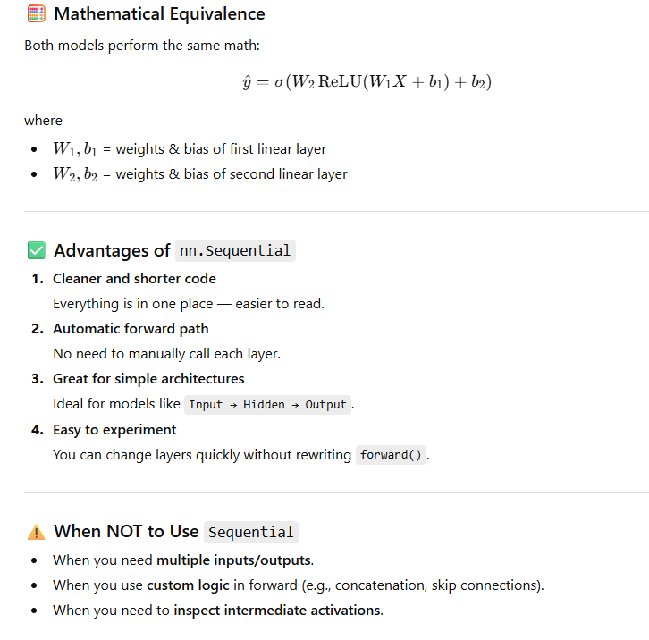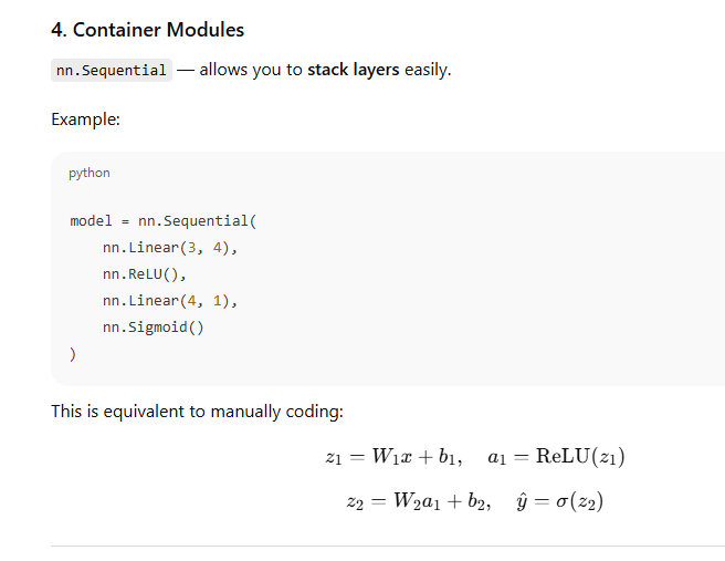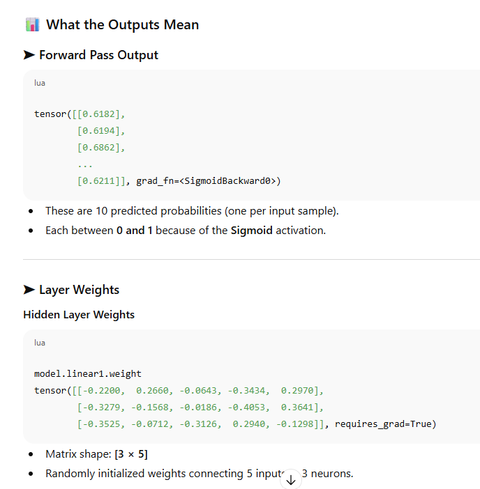Each layer automatically manages its weights and biases, and PyTorch handles gradient calculations during training.