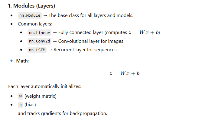 Pre-built layers (like nn.Linear, nn.Conv2d)