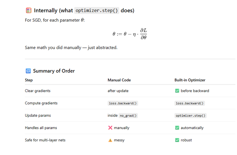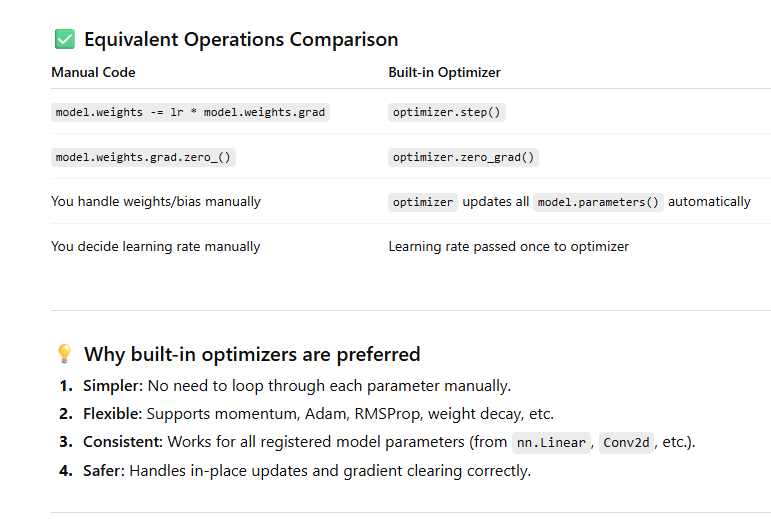 Difference between manual gradient descent and PyTorch’s built-in optimizers