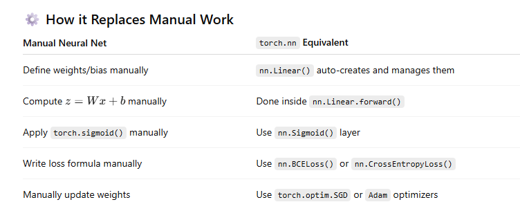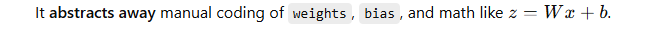 It is the core building block for creating and training neural networks easily without manually defining weights, biases, and formulas.