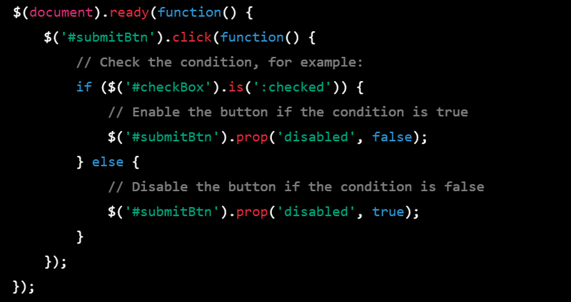 In your JavaScript code, use jQuery to select the button and attach a click event handler to it. Inside the event handler, check the condition and enable/disable the button accordingly. For example: