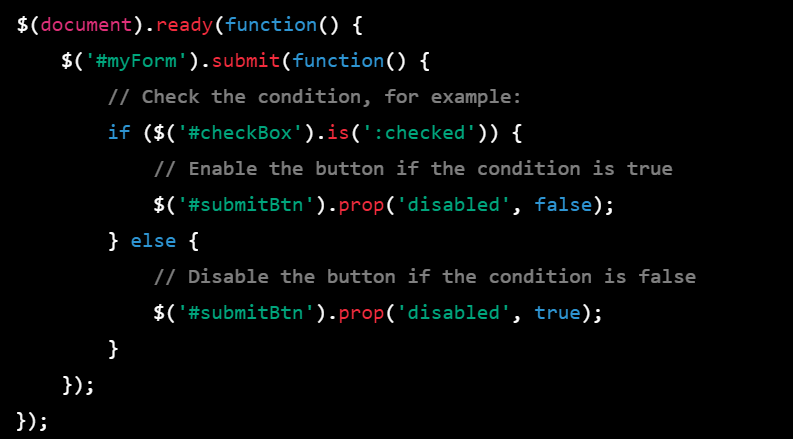In your JavaScript code, use jQuery to select the form and attach a submit event handler to it. Inside the event handler, check the condition and enable/disable the button accordingly. For example: