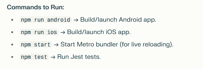 npm run android/npm run ios → Automatically handles native navigation setup.