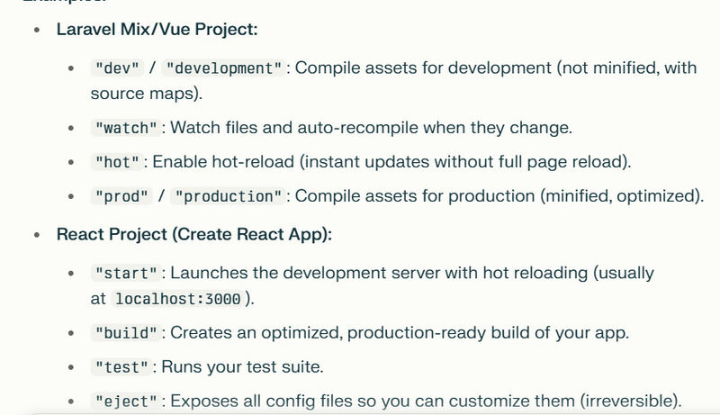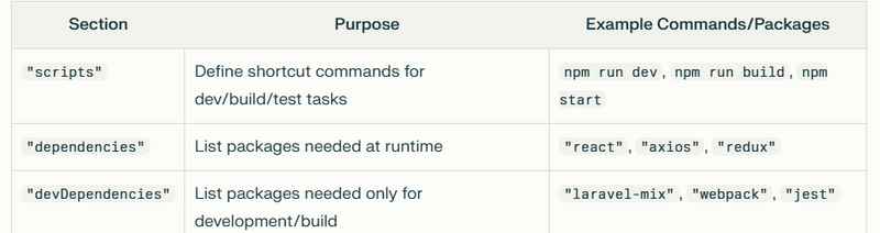 "devDependencies": Packages needed only for development/building (e.g. Webpack, Babel, Laravel Mix, testing tools).