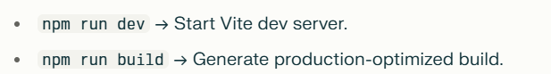 npm run build → Uses Vite’s built-in optimizations (minification, tree-shaking).
