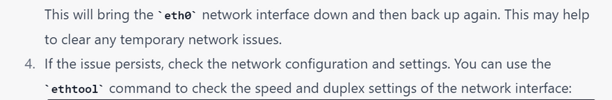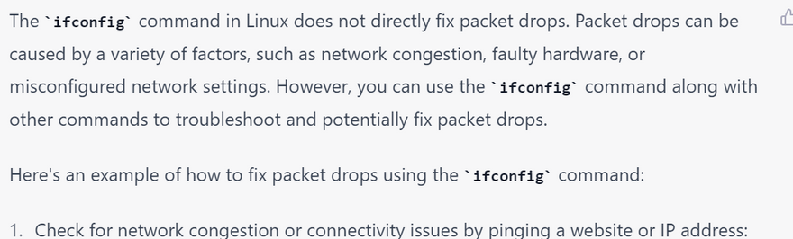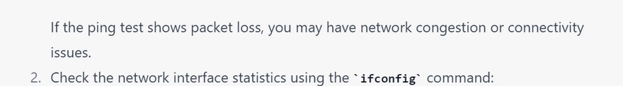 Note: The ping command sends ICMP packets to the destination and waits for a response. It is not always reliable and may not work in some cases, such as when ICMP packets are blocked by a firewall. There are other tools like traceroute and mtr that can also be used to check network packet loss.