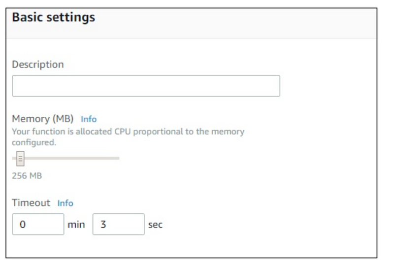 Here you need to enter the short description of what your Lambda function is doing. Select the memory and timeout which are required for the Lambda function.