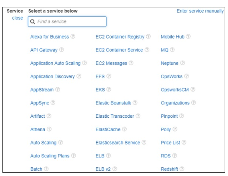 Choose a Service for which you are creating the policy. Later it will display data for Actions, resources and Request conditions.
