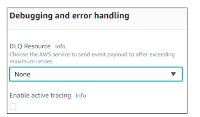 For debugging and errors handling, you can select AWS service to send the details. The options available are None, SNS and SQS.