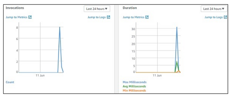 Select the monitoring tab to view the execution details of Lambda function. The graphs show the details of the execution time, errors occured etc.