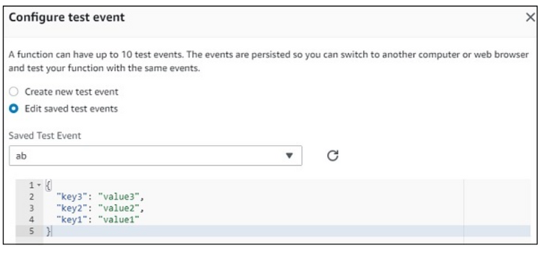 Now, if you click Test button, it will ask for a test event. You can pass a sample test event as follows −