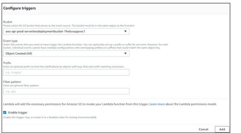 Here you need to select the bucket name, event type on which you want to trigger Lambda, prefix and filter pattern if any and Add the trigger.