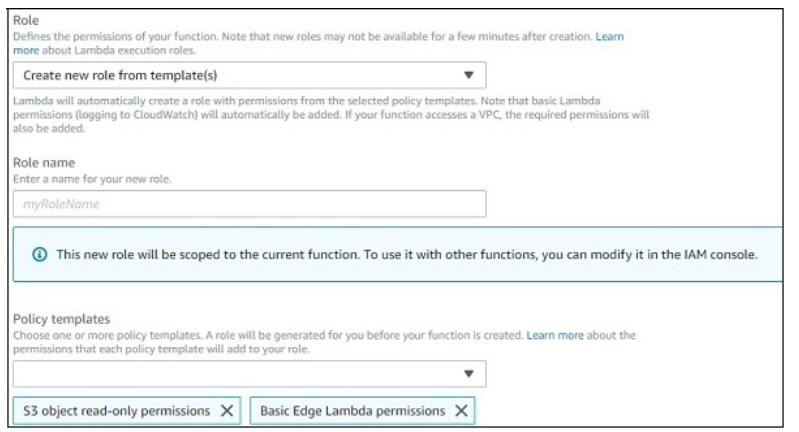 Note that you can select the role you require incase you need any modification for the role created. If we select Author from scratch option, you have to enter Name, Runtime and Role.