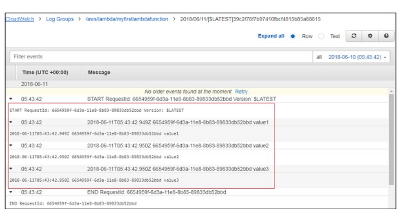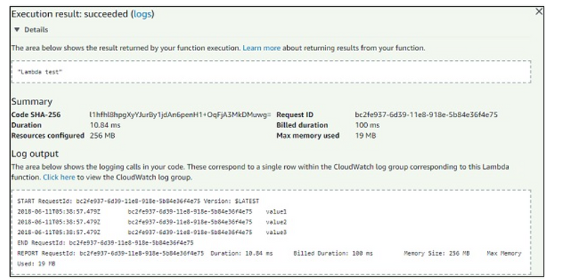 Now, save the test event and click the test button to see the execution of AWS Lambda function −