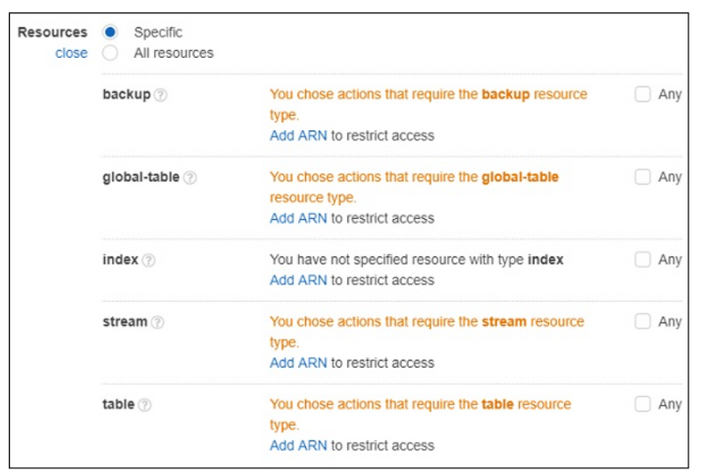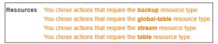Now, enter the Access level you want to give to DynamoDB. Then, resources will display the following details −