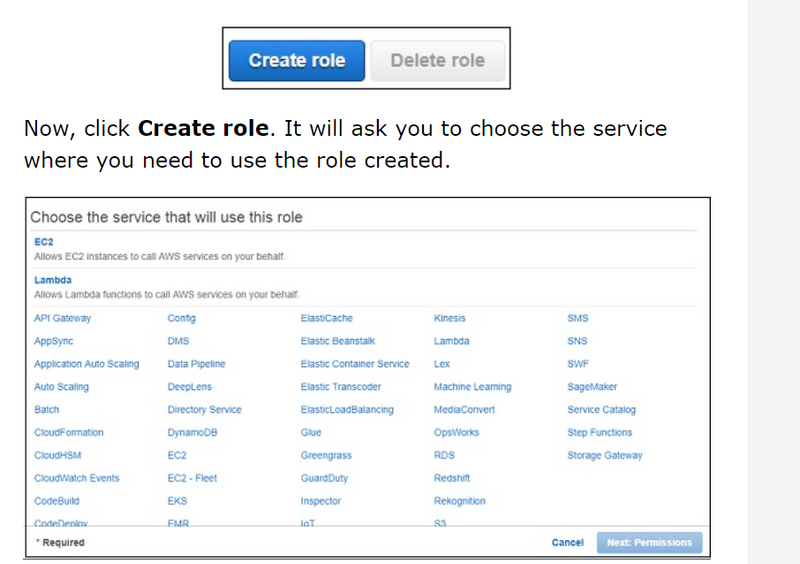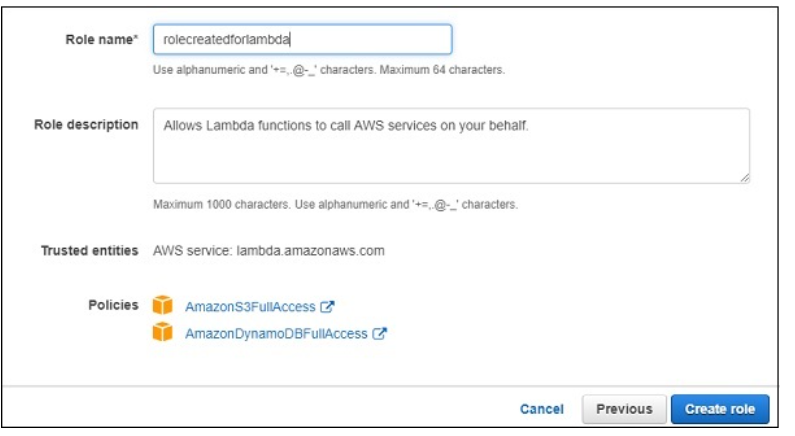 Here, we have selected two policies AmazonS3FullAccess and AmazonDynamoDBFullACcess. We have given full access to S3 and DynamoDB in that role. However, it is suggested that you give permission only to necessary buckets and tables.