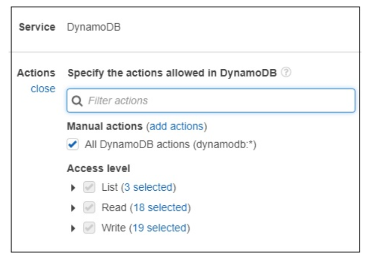 Now, we should choose the service. Let us select AWS Dynamodb from search. Actions has following details −