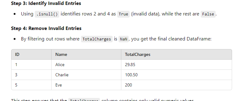 df[pd.to_numeric(df.TotalCharges, errors='coerce').isnull()] filters out the rows where TotalCharges could not be converted to numeric, keeping only rows with valid data.