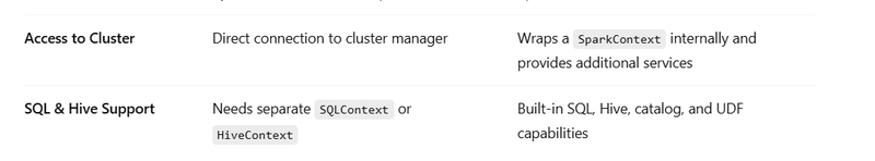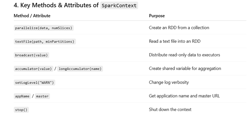SparkContext → like the engine of a car (makes the cluster run, handles RDDs)