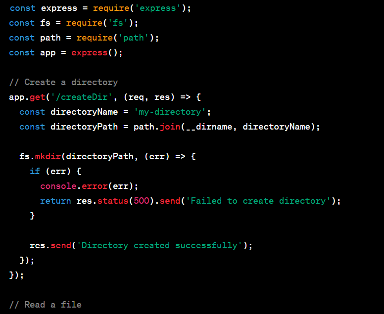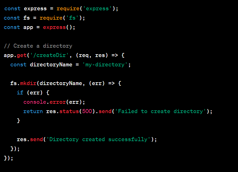 - /createDir creates a new directory named 'my-directory' using fs.mkdir(). If there's an error, it logs the error and sends a 500 response. Otherwise, it sends a success message.