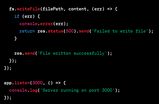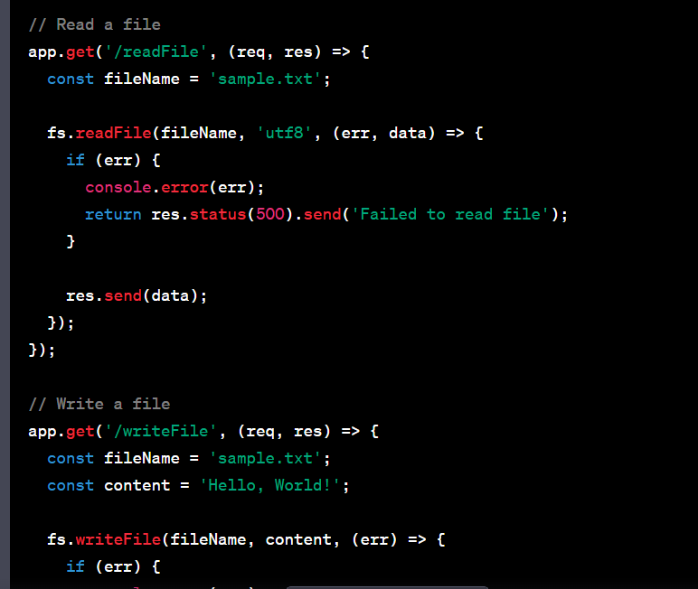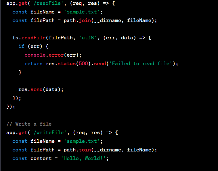 - /writeFile writes the content 'Hello, World!' to a file named 'sample.txt' using fs.writeFile(). If there's an error, it logs the error and sends a 500 response. Otherwise, it sends a success message . Please note that you need to have the necessary permissions and ensure that the specified directory and file exist or have appropriate write/read permissions, respectively. You can modify the example as needed to suit your use case.