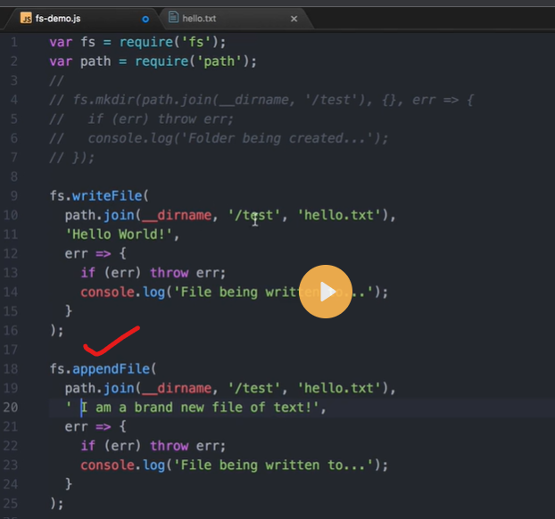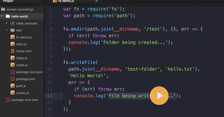 - /writeFile writes the content 'Hello, World!' to a file named 'sample.txt' using fs.writeFile() and the path created with path.join() . If there's an error, it logs the error and sends a 500 response. Otherwise, it sends a success message. By utilizing the path module, you can create file and directory paths in a platform-independent manner and perform file system operations effectively.