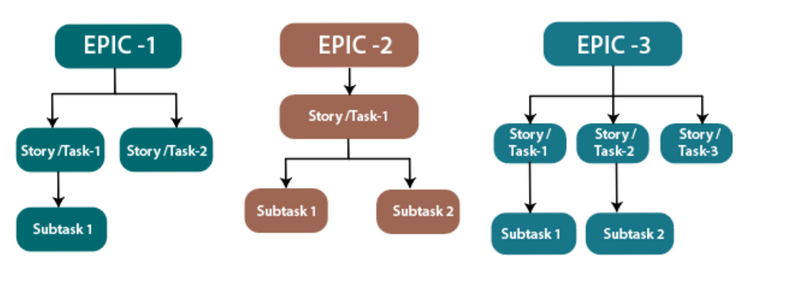 - First, Epics are converted into user stories, and then user stories are converted into several tasks on which agile team work.