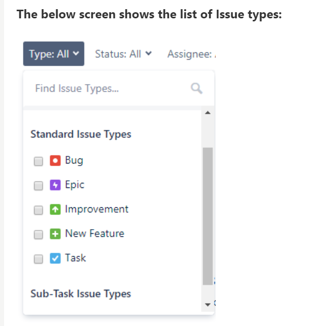 - You can report issue types separately. Issues are categorized by issue types; for example, you want to report the progress of your work of the previous week . Subtask