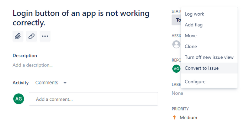 On clicking on the Convert to Issue, the screen appears which is shown below. You can select the issue type of your choice.