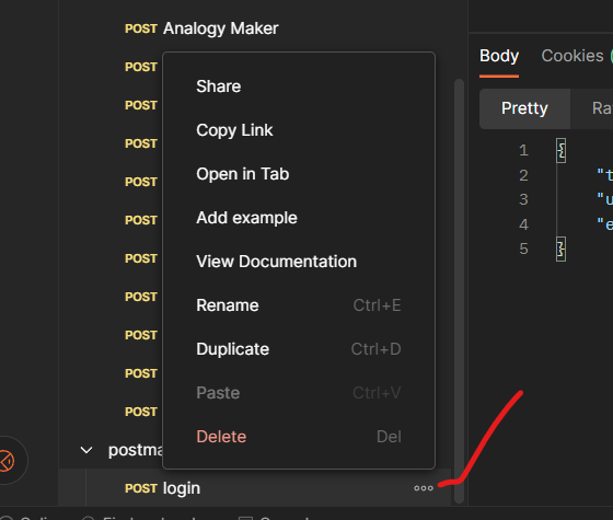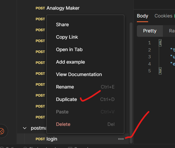 rakesh kumar Posted on Jun 14, 2023 How to create new api using duplicate tab in existing collection in postman step 1: click three dot in api request under existing collection step 2:click duplicate step3: rename it step4: save it now new api request appear in left sidebar Top comments (0) Subscribe Personal Trusted User Create template Templates let you quickly answer FAQs or store snippets for re-use. Submit Preview Dismiss Code of Conduct • Report abuse Are you sure you want to hide this comment? It will become hidden in your post, but will still be visible via the comment's permalink. Hide child comments as well Confirm For further actions, you may consider blocking this person and/or reporting abuse