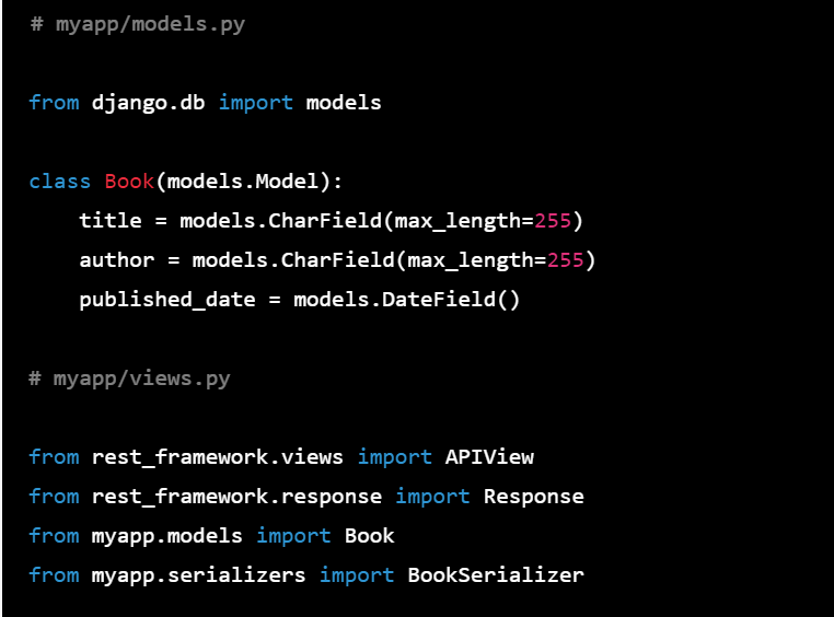 - Define the views for the app in the myapp/views.py file, using Django REST framework to create the API endpoints