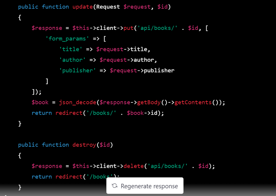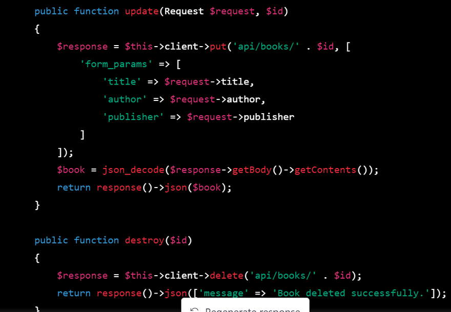 $response = $this->client->delete('api/books/' . $id);