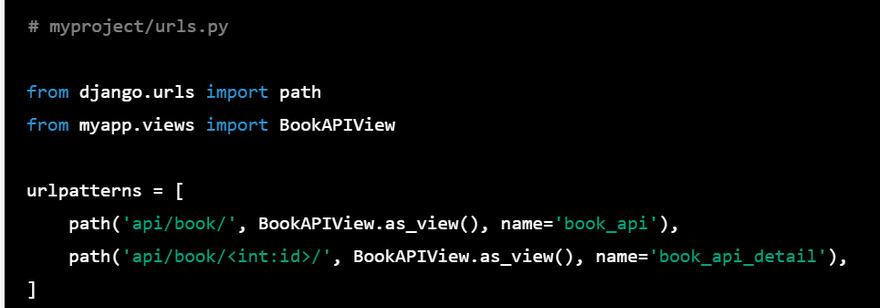 Define a URL pattern in the myproject/urls.py file that maps to the BookAPIView view