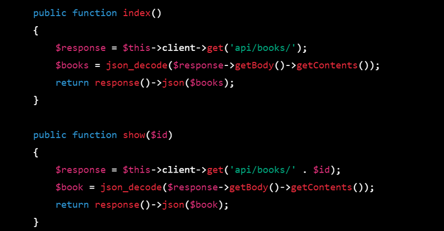 In each method, use GuzzleHTTP to send requests to the Python/Django API endpoint